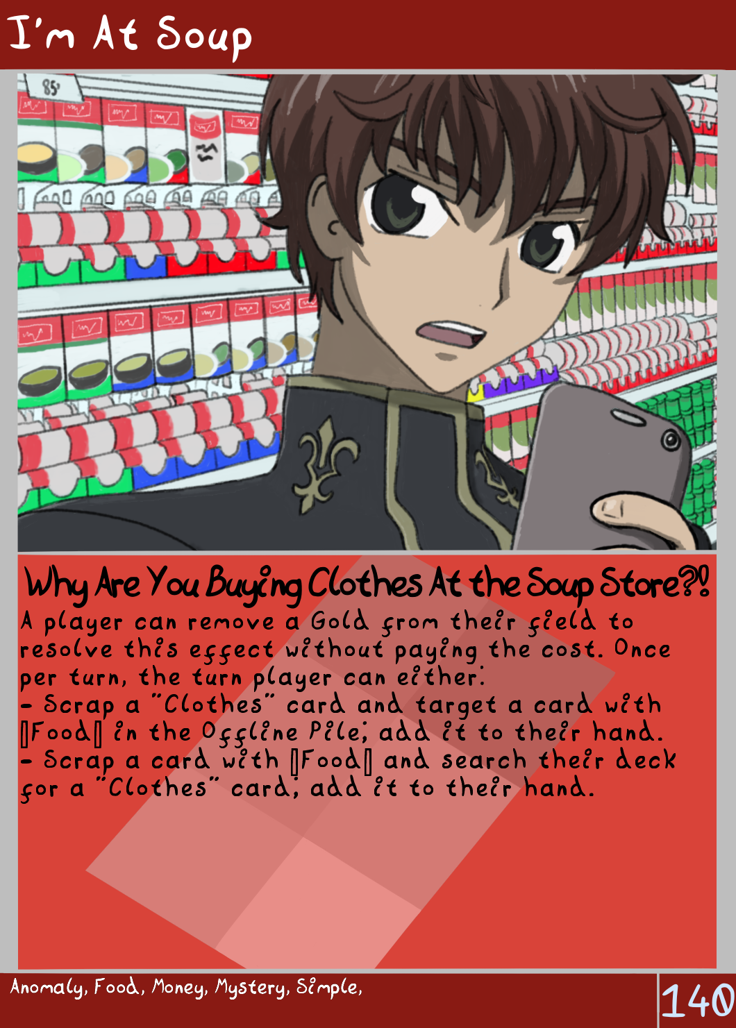 Suzaku is trying to buy clothes at the soup store.